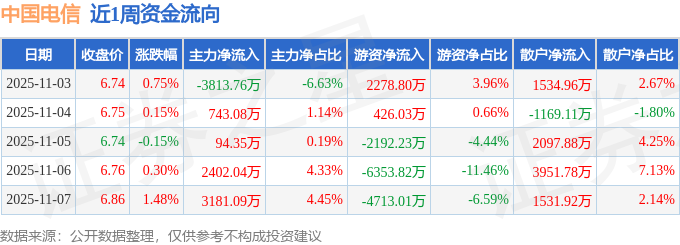 资金流向数据方面,本周中国电信主力资金合计净流入2606.82万元,游资资金合计净流出1.06亿元,散户资金合计净流入7947.43万元。本周资金流向一览见下表: