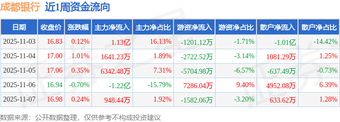 资金流向数据方面,本周成都银行主力资金合计净流入8005.46万元,游资资金合计净流出3924.65万元,散户资金合计净流出4080.81万元。本周资金流向一览见下表: