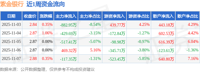 资金流向数据方面,本周紫金银行主力资金合计净流出1478.08万元,游资资金合计净流出701.2万元,散户资金合计净流入2179.29万元。本周资金流向一览见下表: