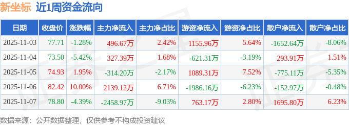 资金流向数据方面,本周新坐标主力资金合计净流入190.02万元,游资资金合计净流入400.98万元,散户资金合计净流出591.0万元。本周资金流向一览见下表: