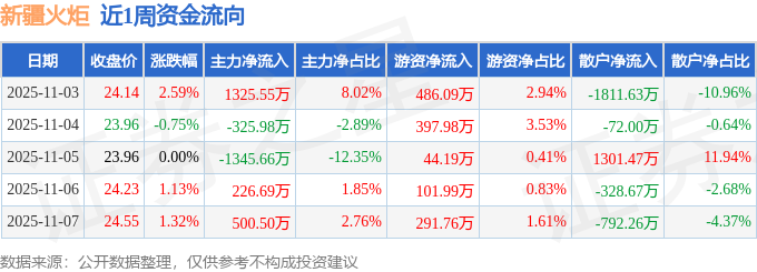 资金流向数据方面,本周新疆火炬主力资金合计净流入381.08万元,游资资金合计净流入1322.01万元,散户资金合计净流出1703.09万元。本周资金流向一览见下表: