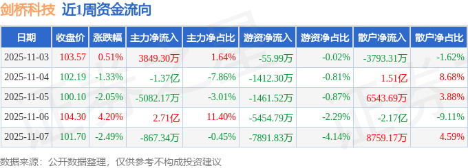 资金流向数据方面,本周剑桥科技主力资金合计净流入1.14亿元,游资资金合计净流出1.63亿元,散户资金合计净流入4909.63万元。本周资金流向一览见下表: