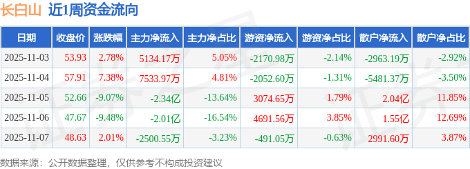 资金流向数据方面,本周长白山主力资金合计净流出3.34亿元,游资资金合计净流入3051.58万元,散户资金合计净流入3.04亿元。本周资金流向一览见下表: