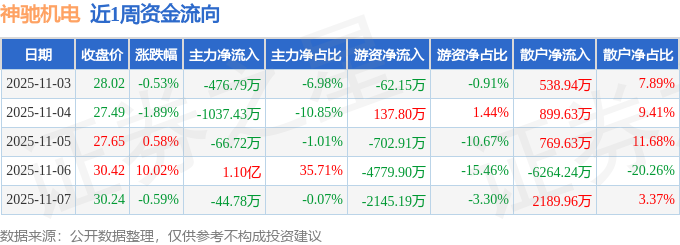 资金流向数据方面,本周神驰机电主力资金合计净流入9418.43万元,游资资金合计净流出7552.35万元,散户资金合计净流出1866.08万元。本周资金流向一览见下表: