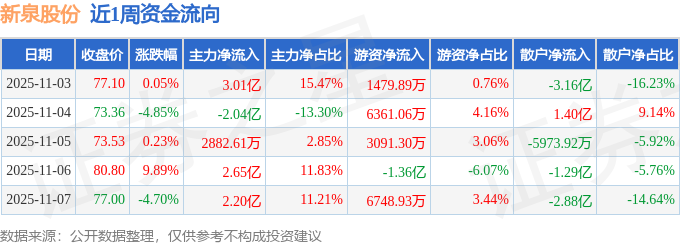 资金流向数据方面,本周新泉股份主力资金合计净流入6.11亿元,游资资金合计净流入4102.37万元,散户资金合计净流出6.52亿元。本周资金流向一览见下表:
