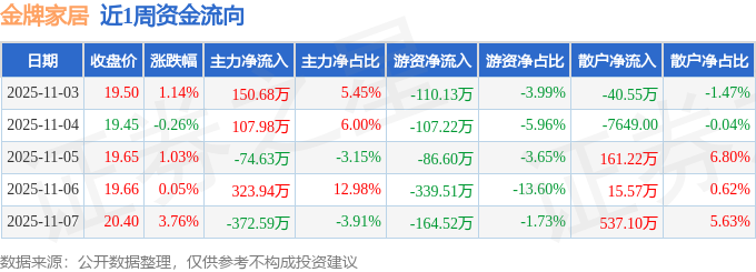 资金流向数据方面,本周金牌家居主力资金合计净流入135.39万元,游资资金合计净流出807.98万元,散户资金合计净流入672.59万元。本周资金流向一览见下表:
