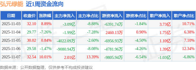 资金流向数据方面,本周弘元绿能主力资金合计净流出4.38亿元,游资资金合计净流出2.55亿元,散户资金合计净流入6.93亿元。本周资金流向一览见下表: