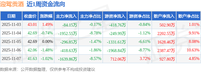 资金流向数据方面,本周迎驾贡酒主力资金合计净流出4392.04万元,游资资金合计净流出3257.14万元,散户资金合计净流入7649.18万元。本周资金流向一览见下表: