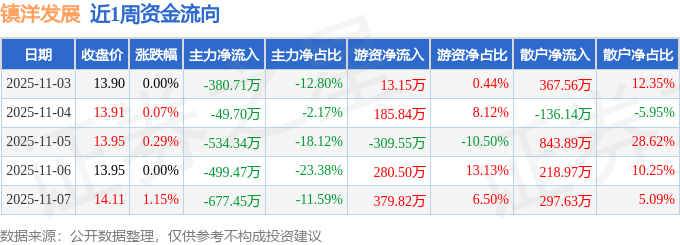 资金流向数据方面,本周镇洋发展主力资金合计净流出2141.67万元,游资资金合计净流入549.76万元,散户资金合计净流入1591.91万元。本周资金流向一览见下表: