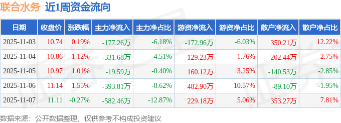 资金流向数据方面,本周联合水务主力资金合计净流出1504.78万元,游资资金合计净流入828.48万元,散户资金合计净流入676.31万元。本周资金流向一览见下表:
