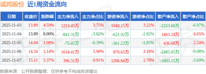 资金流向数据方面,本周诚邦股份主力资金合计净流入2307.4万元,游资资金合计净流入2134.49万元,散户资金合计净流出4441.89万元。本周资金流向一览见下表: