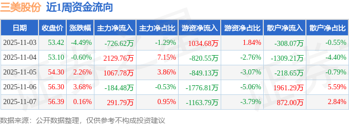 资金流向数据方面,本周三美股份主力资金合计净流入2578.23万元,游资资金合计净流出3575.6万元,散户资金合计净流入997.38万元。本周资金流向一览见下表: