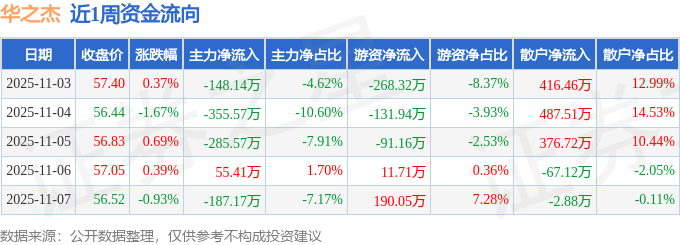 资金流向数据方面,本周华之杰主力资金合计净流出921.03万元,游资资金合计净流出289.66万元,散户资金合计净流入1210.69万元。本周资金流向一览见下表: