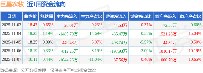 资金流向数据方面,本周巨星农牧主力资金合计净流出2864.87万元,游资资金合计净流出645.04万元,散户资金合计净流入3509.91万元。本周资金流向一览见下表: