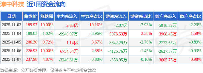 资金流向数据方面,本周淳中科技主力资金合计净流入3.15亿元,游资资金合计净流出2.79亿元,散户资金合计净流出3644.25万元。本周资金流向一览见下表: