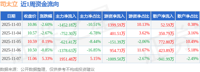 资金流向数据方面,本周司太立主力资金合计净流出2253.03万元,游资资金合计净流入1594.95万元,散户资金合计净流入658.08万元。本周资金流向一览见下表: