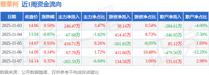 资金流向数据方面,本周普莱柯主力资金合计净流入397.69万元,游资资金合计净流入497.15万元,散户资金合计净流出894.83万元。本周资金流向一览见下表: