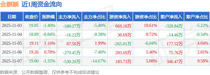 资金流向数据方面,本周金麒麟主力资金合计净流出1078.64万元,游资资金合计净流入822.2万元,散户资金合计净流入256.44万元。本周资金流向一览见下表: