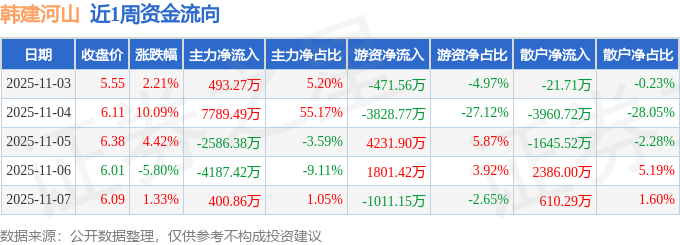 资金流向数据方面,本周韩建河山主力资金合计净流入1909.83万元,游资资金合计净流入721.83万元,散户资金合计净流出2631.66万元。本周资金流向一览见下表: