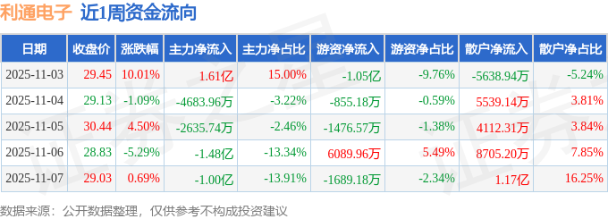 资金流向数据方面,本周利通电子主力资金合计净流出1.6亿元,游资资金合计净流出8441.76万元,散户资金合计净流入2.44亿元。本周资金流向一览见下表: