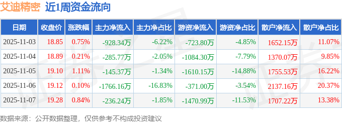 资金流向数据方面,本周艾迪精密主力资金合计净流出3361.89万元,游资资金合计净流出5260.24万元,散户资金合计净流入8622.13万元。本周资金流向一览见下表:
