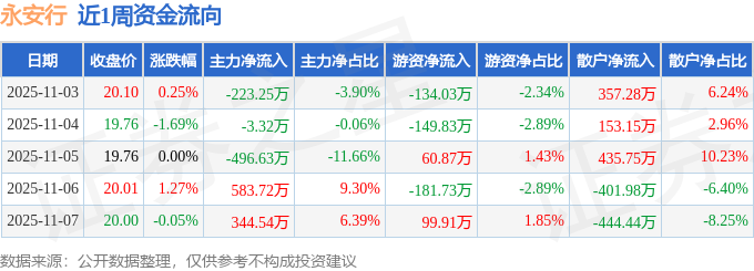 资金流向数据方面,本周永安行主力资金合计净流入205.06万元,游资资金合计净流出304.81万元,散户资金合计净流入99.75万元。本周资金流向一览见下表: