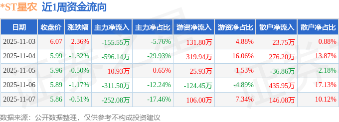 资金流向数据方面,本周*ST星农主力资金合计净流出1304.34万元,游资资金合计净流入459.21万元,散户资金合计净流入845.12万元。本周资金流向一览见下表: