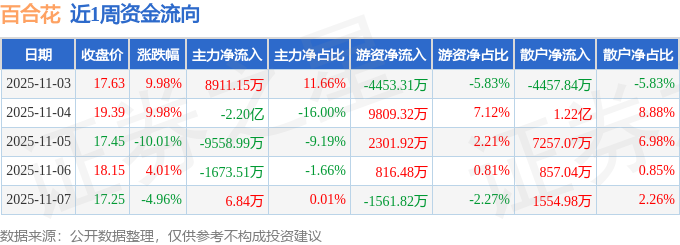 资金流向数据方面,本周百合花主力资金合计净流出2.43亿元,游资资金合计净流入6912.58万元,散户资金合计净流入1.74亿元。本周资金流向一览见下表: