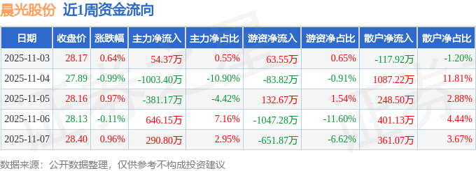 资金流向数据方面,本周晨光股份主力资金合计净流出393.25万元,游资资金合计净流出1586.75万元,散户资金合计净流入1980.0万元。本周资金流向一览见下表: