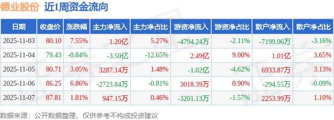 资金流向数据方面,本周德业股份主力资金合计净流出2.15亿元,游资资金合计净流入9700.3万元,散户资金合计净流入1.18亿元。本周资金流向一览见下表:
