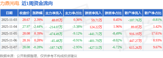 资金流向数据方面,本周力鼎光电主力资金合计净流出873.73万元,游资资金合计净流出1087.08万元,散户资金合计净流入1960.81万元。本周资金流向一览见下表: