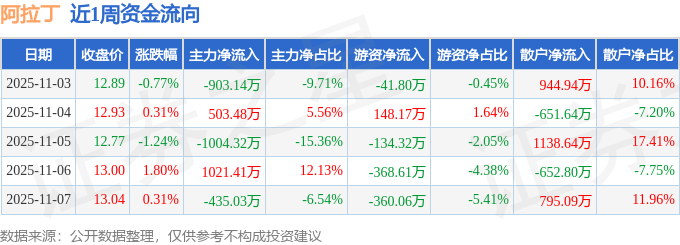 资金流向数据方面,本周阿拉丁主力资金合计净流出817.6万元,游资资金合计净流出756.63万元,散户资金合计净流入1574.22万元。本周资金流向一览见下表: