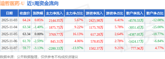 资金流向数据方面,本周迪哲医药主力资金合计净流入6354.85万元,游资资金合计净流入6300.19万元,散户资金合计净流出1.27亿元。本周资金流向一览见下表: