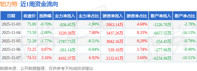 资金流向数据方面,本周铂力特主力资金合计净流入3437.34万元,游资资金合计净流入1.12亿元,散户资金合计净流出1.47亿元。本周资金流向一览见下表:
