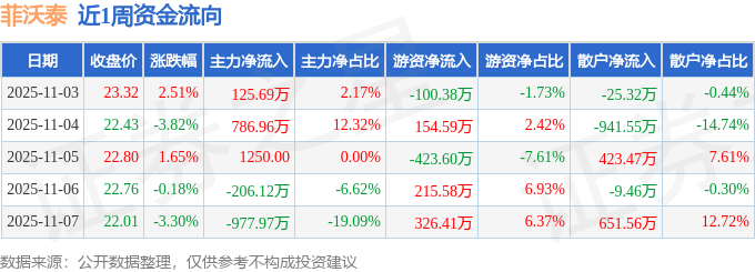 资金流向数据方面,本周菲沃泰主力资金合计净流出271.31万元,游资资金合计净流入172.6万元,散户资金合计净流入98.7万元。本周资金流向一览见下表:
