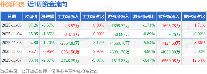 资金流向数据方面,本周伟测科技主力资金合计净流入1237.13万元,游资资金合计净流出1.26亿元,散户资金合计净流入1.13亿元。本周资金流向一览见下表: