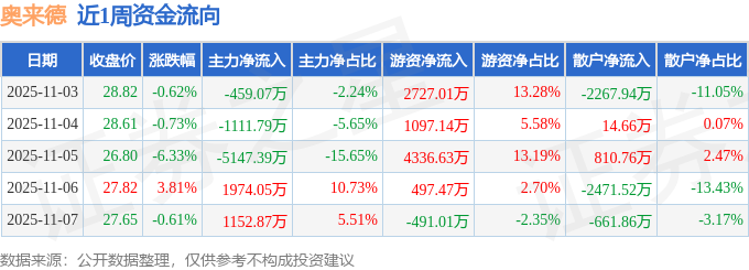 资金流向数据方面,本周奥来德主力资金合计净流出3591.33万元,游资资金合计净流入8167.23万元,散户资金合计净流出4575.9万元。本周资金流向一览见下表:
