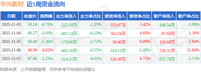 资金流向数据方面,本周华光新材主力资金合计净流出1583.93万元,游资资金合计净流入958.66万元,散户资金合计净流入625.26万元。本周资金流向一览见下表: