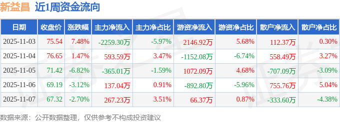 资金流向数据方面,本周新益昌主力资金合计净流出1626.45万元,游资资金合计净流入1240.51万元,散户资金合计净流入385.94万元。本周资金流向一览见下表: