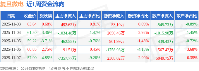 资金流向数据方面,本周复旦微电主力资金合计净流出8170.67万元,游资资金合计净流入3554.64万元,散户资金合计净流入4616.03万元。本周资金流向一览见下表: