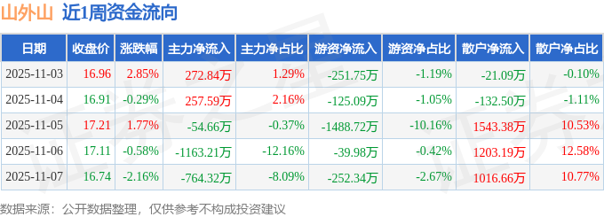 资金流向数据方面,本周山外山主力资金合计净流出1451.77万元,游资资金合计净流出2157.87万元,散户资金合计净流入3609.64万元。本周资金流向一览见下表: