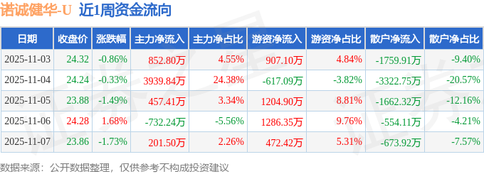 资金流向数据方面,本周诺诚健华主力资金合计净流入4719.32万元,游资资金合计净流入3253.68万元,散户资金合计净流出7973.0万元。本周资金流向一览见下表: