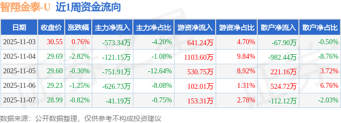 资金流向数据方面,本周智翔金泰主力资金合计净流出2114.33万元,游资资金合计净流入2530.91万元,散户资金合计净流出416.58万元。本周资金流向一览见下表: