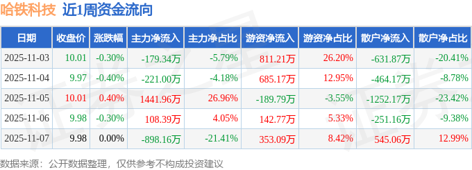 资金流向数据方面,本周哈铁科技主力资金合计净流入251.85万元,游资资金合计净流入1802.45万元,散户资金合计净流出2054.3万元。本周资金流向一览见下表: