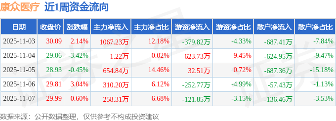 资金流向数据方面,本周康众医疗主力资金合计净流入2291.81万元,游资资金合计净流出98.2万元,散户资金合计净流出2193.61万元。本周资金流向一览见下表: