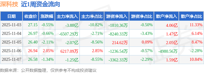 资金流向数据方面,本周深科技主力资金合计净流出7.24亿元,游资资金合计净流出1.44亿元,散户资金合计净流入8.68亿元。本周资金流向一览见下表: