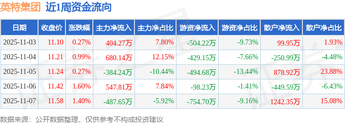 资金流向数据方面,本周英特集团主力资金合计净流入760.34万元,游资资金合计净流出2280.98万元,散户资金合计净流入1520.64万元。本周资金流向一览见下表: