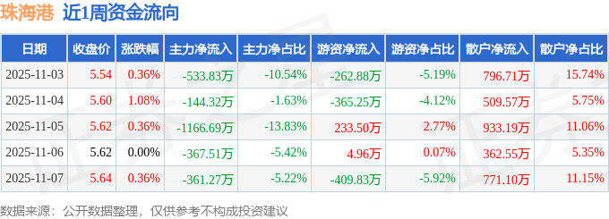 资金流向数据方面,本周珠海港主力资金合计净流出2573.62万元,游资资金合计净流出799.5万元,散户资金合计净流入3373.12万元。本周资金流向一览见下表: