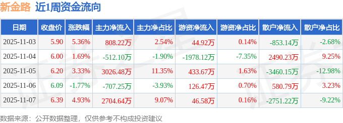 资金流向数据方面,本周新金路主力资金合计净流入5319.99万元,游资资金合计净流出1326.49万元,散户资金合计净流出3993.49万元。本周资金流向一览见下表: