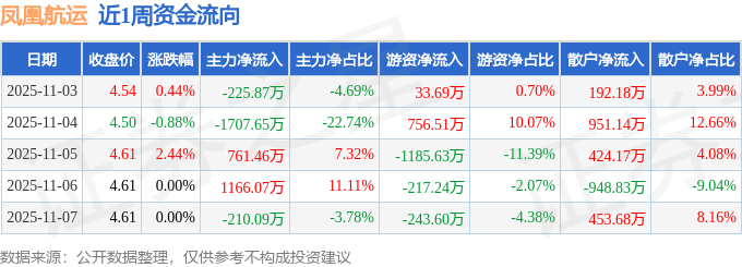 资金流向数据方面,本周凤凰航运主力资金合计净流出216.07万元,游资资金合计净流出856.26万元,散户资金合计净流入1072.33万元。本周资金流向一览见下表:
